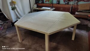 Du kannst dir sicherlich vorstellen, dass ich zunächst nachdenken musste. Wie sollte ich einen Sechseck-Tisch mit einer Breite von 2,60 Metern durch die Tür bekommen? Meine Idee war, ihn einfach in zwei Teilen zu fertigen, mit einem sichtbaren Rahmen, sodass ich den Tisch mittig mit Klippern zusammenfügen kann.