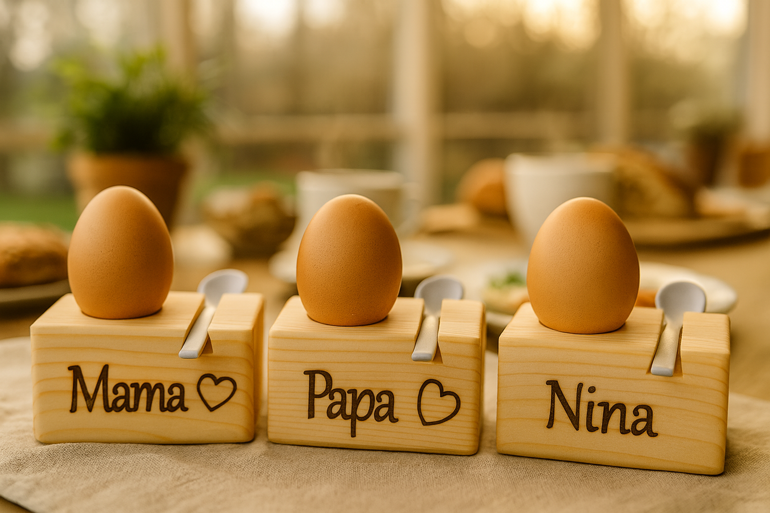 Drei personalisierte Eierbecher aus Holz mit Ei und Löffel auf einem Frühstückstisch im Wintergarten