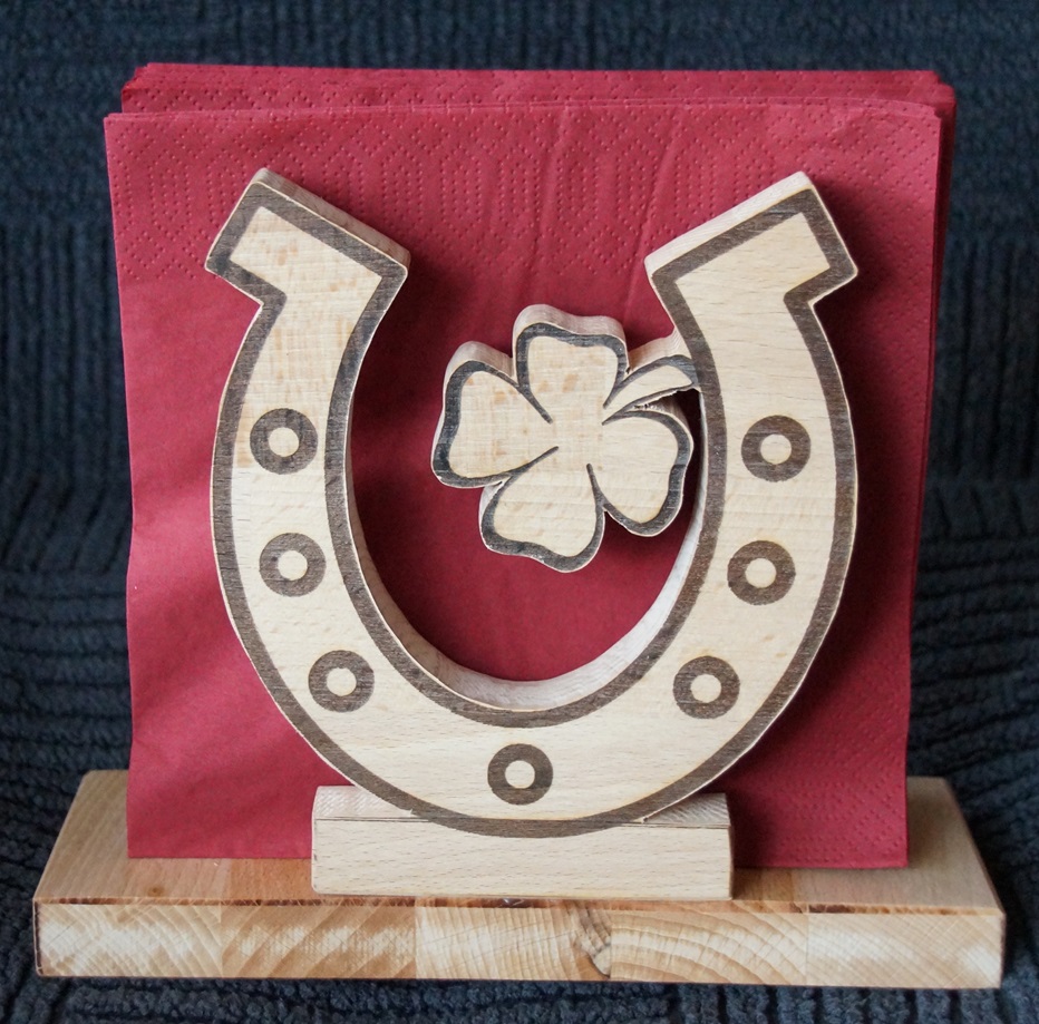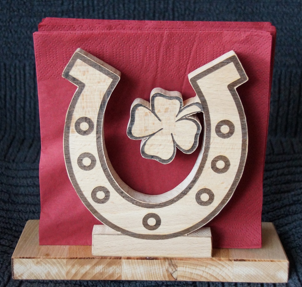 Entdecke unseren handgefertigten Klee & Hufeisen Serviettenhalter aus hochwertigem Buchenleimholz!