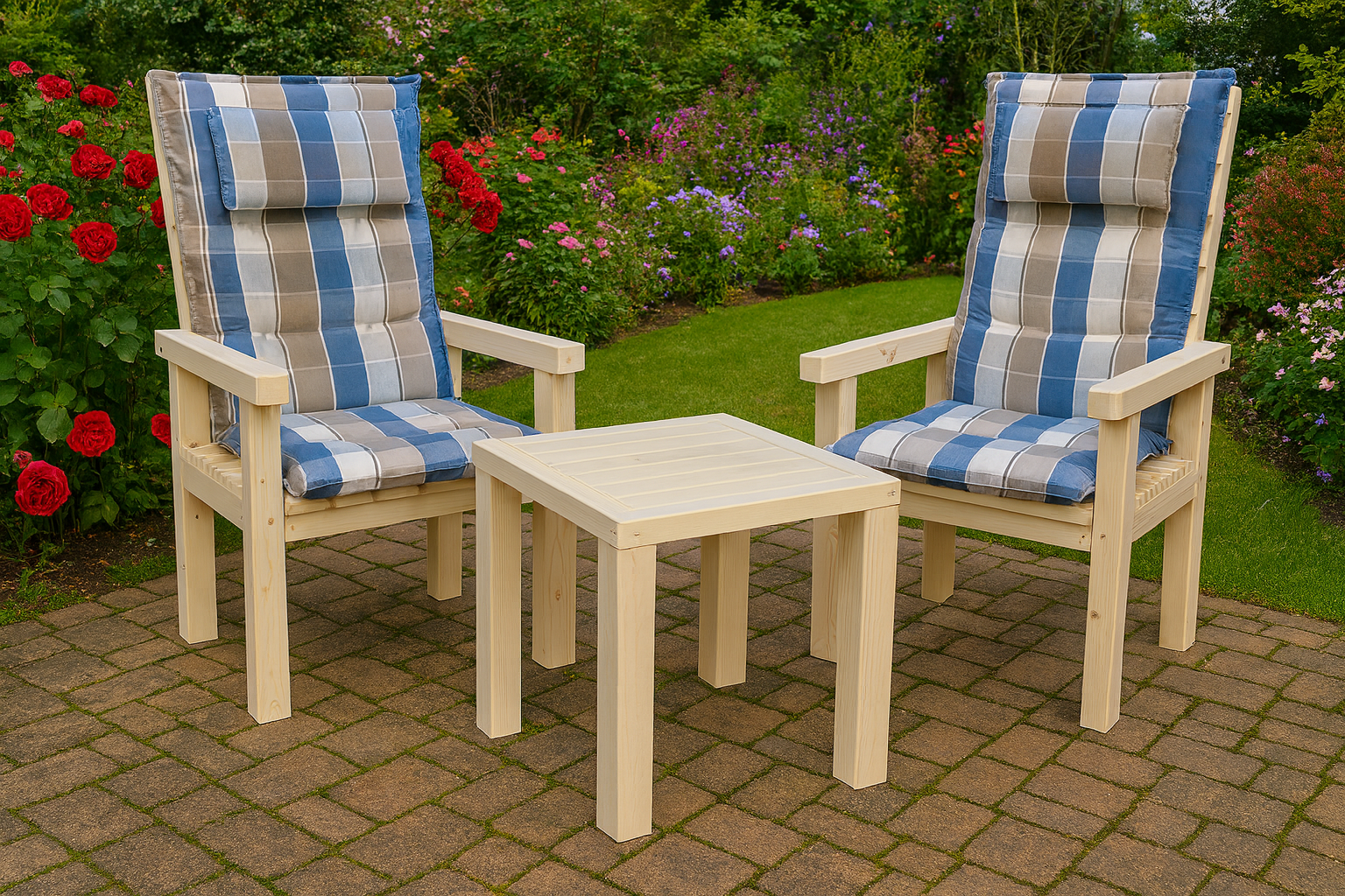 Kreativ-Holz Gartenmöbelset: Hochlehner-Gartenstühle mit Loungetisch – 100 % handgefertigt
